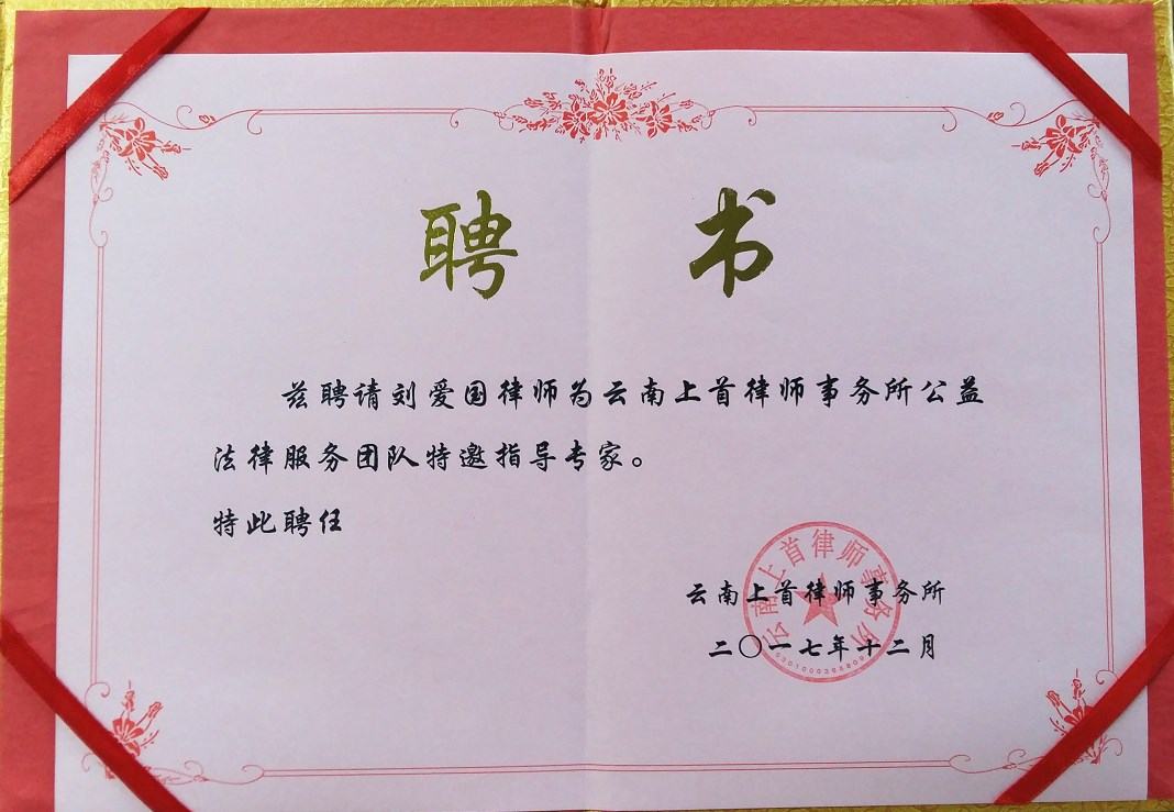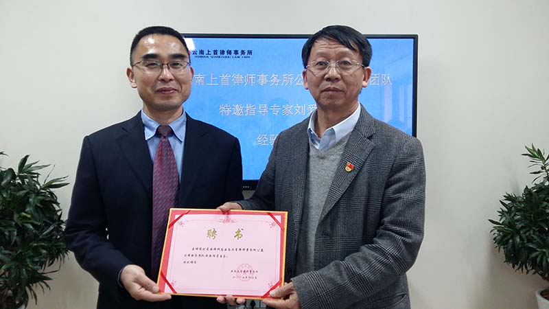 近日,云南上首律师事务所聘请刘爱国律师为律所公益法律服务队特邀指导专家。