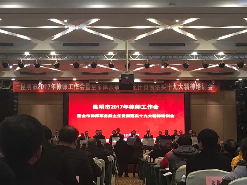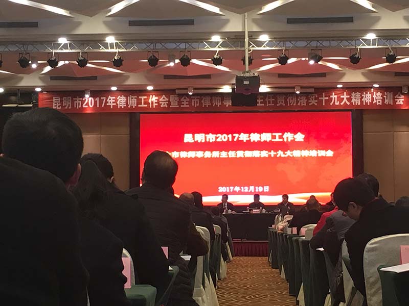 2017年12月19日,昆明市司法局组织召开了“昆明市2017年律师工作会暨全市律师事务所主任贯彻落实十九大精神培训会”。中共昆明市委政法委书记李建阳同志,昆明市司法局党委书记、局长孙跃文同志等领导出席会议并发表讲话,全市各区司法局领导,全市各律师事务所主任参会。