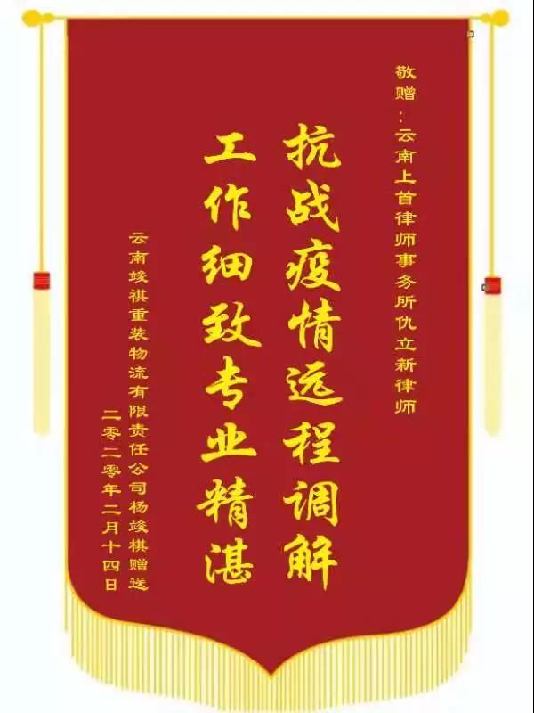 由于案件及时处理,解了当事人的燃眉之急,委托人感激之余特地为仇立新律师制作了一面特殊的电子锦旗,第一时间转交给了云南上首律师事务所。