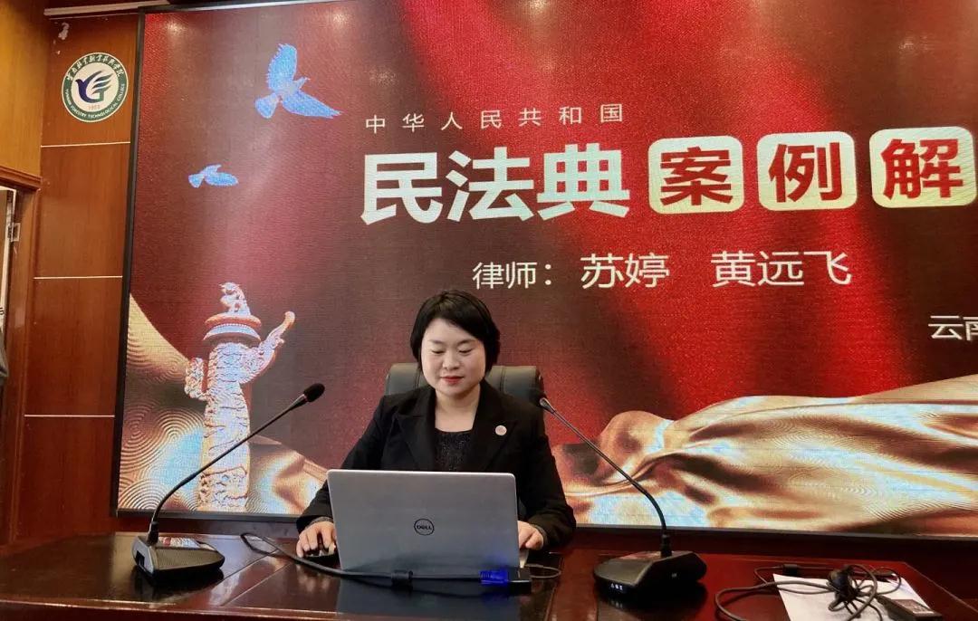 在我所律师多次到社区、企业等地开展《民法典》讲座之后,2020年11月18日下午,我所建筑工程法务部主任黄远飞、专职律师苏婷,到云南林业职业技术学院开展《民法典》讲座。