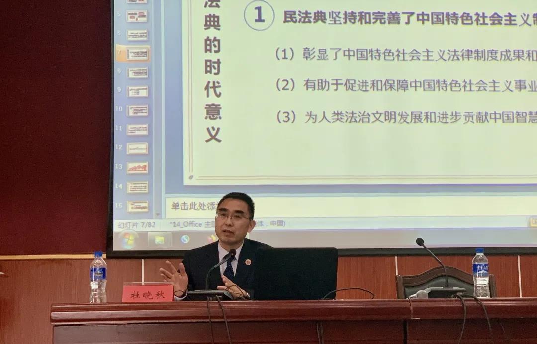 杜晓秋主任从《民法典》完善了中国特色社会主义制度、推进治理体系和治理能力、促进经济高质量发展、维护群众福祉利益、弘扬社会主义价值观到广泛确立保护民事权利、健全市场交易法律制度、彰显中国特色法治等方面进行了分享。通过近两个小时的讲座,师生们对《民法典》的意义及其亮点重点内容有了更进一步的了解,有利于增强法治意识,合法合规的维护自身权益,彰显社会的公平正义。