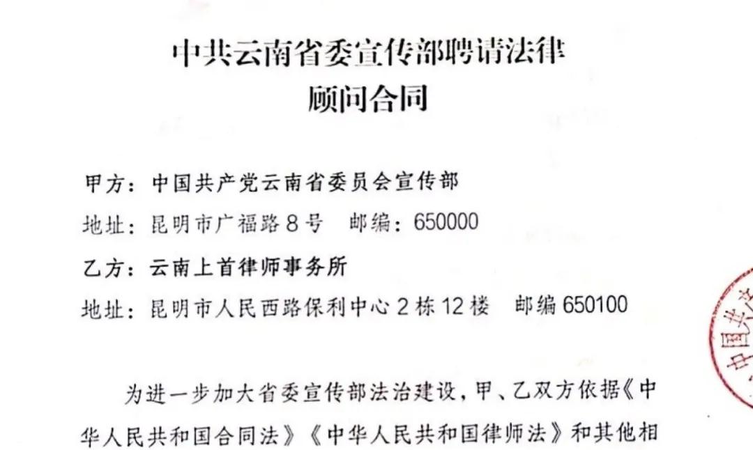 我所一直以来始终秉持着“厚德诚信 专业卓越”的执业态度为顾问单位、当事人提供法律服务。长期以来获得了众多顾问单位、当事人对我所律师工作的认可。近日,我所再次受聘中共云南省委宣传部法律顾问。