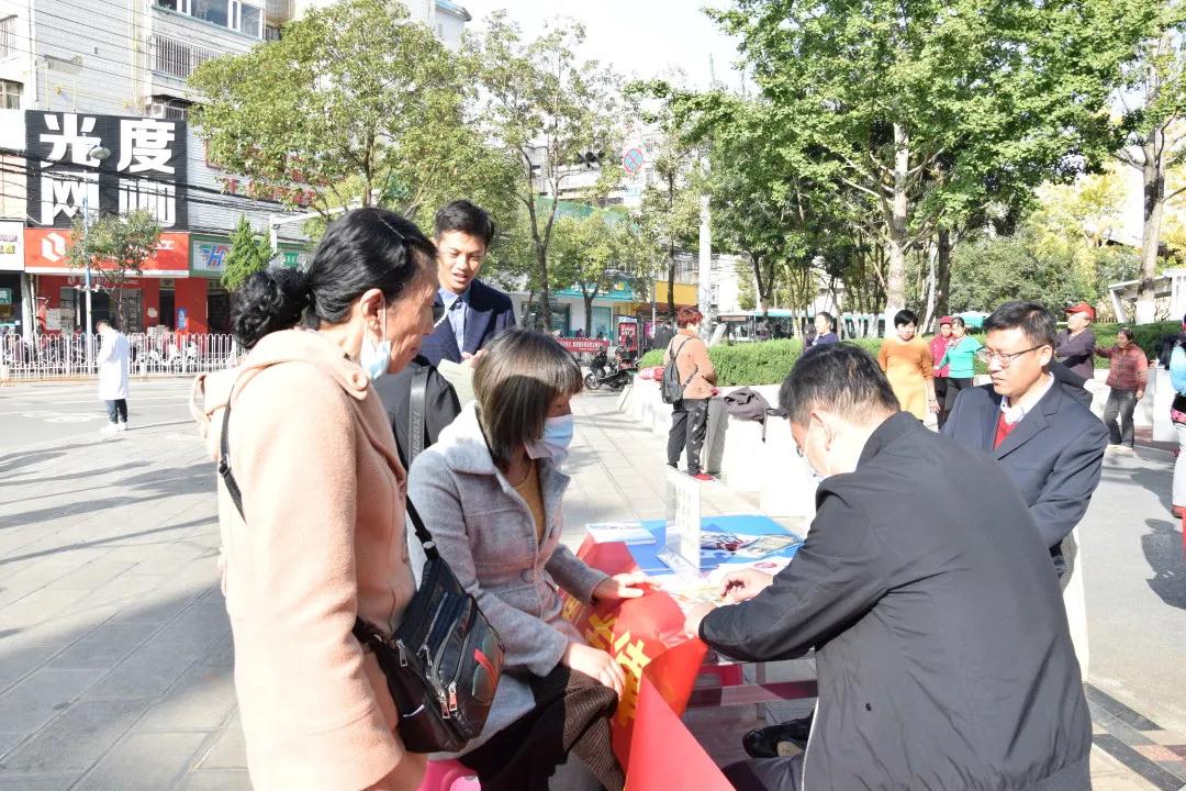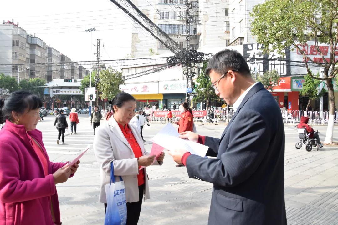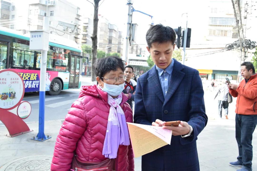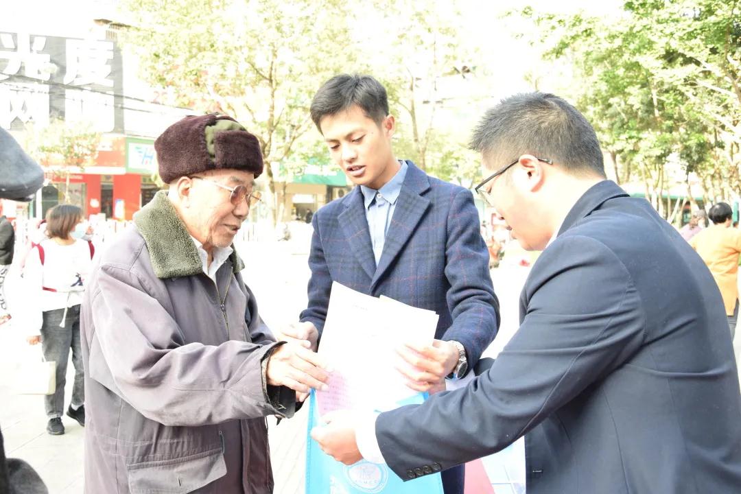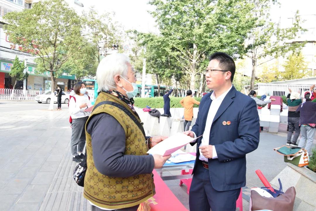 志愿者律师在社区周围街道向商铺和行人发放关于反诈的宣传册,并且对其内容进行讲解。就最新有关双十一、防疫等新型诈骗手段做出提醒。