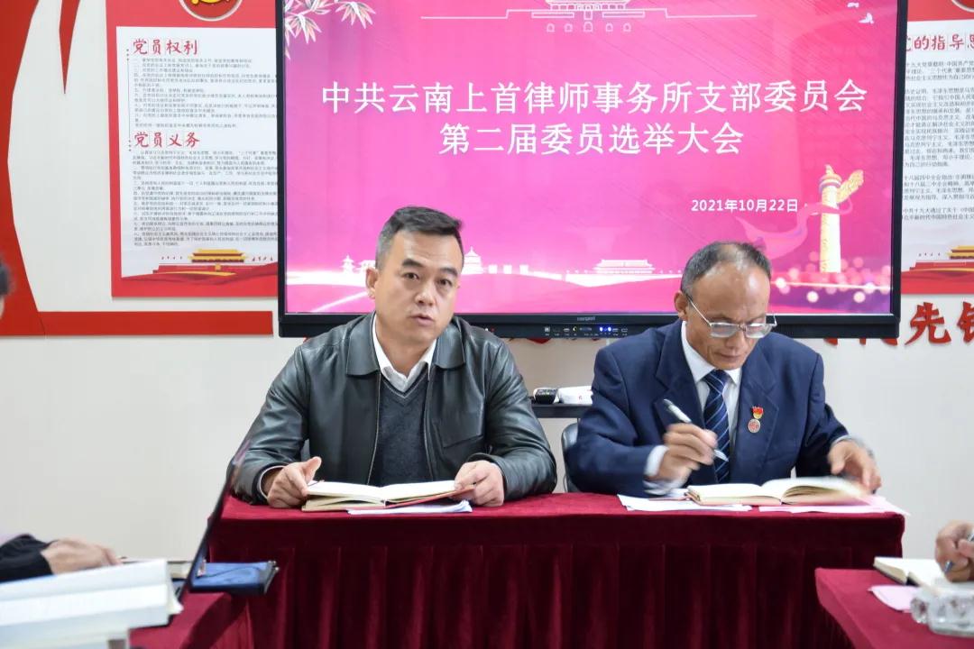 支委报告工作完毕后,支部书记杜开周对新一届支部委员会委员候选人产生情况进行了说明并对候选人情况进行了介绍。会议一致通过了《选举办法(草案)》,选举张德刚为总监票人,吕中海、葛世宽同志为监票人,张光金同志为计票人。经过大会投票选举选举张佩军、黄雯、李家旺为新一届支部委员。紧接着新一届上首律师事务所党支部召开支部委员会议,选举产生张佩军同志为云南上首律师事务所党支部新一届支部书记。