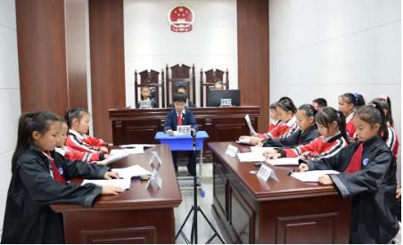 “请大家安静,下面宣布法庭纪律......”“书记员”首先宣读法庭纪律,随着“审判长”法槌的落下,“庭审”正式开始。17名小学生组成了审判长、审判员、律师、书记员、法警、原告被告等11个角色,真实再现了法庭场景。